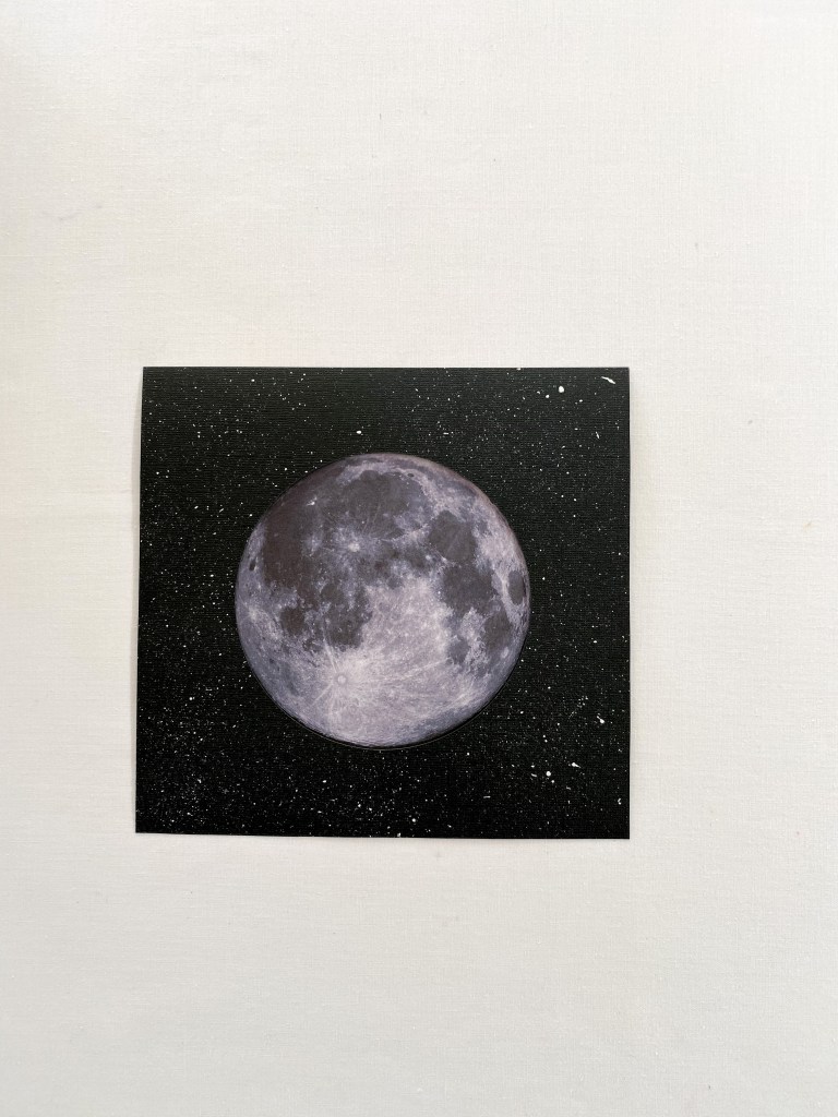 1. Cut a circle shape from the card and flick some white paint onto the card with a paintbrush. These flicks of white paint will represent the stars in the sky. I don’t have a picture with just the circle cut out I’m sorry – you will have to imagine this step. Then, print out a picture of the moon and tape to the back of the black card. (I simply googled the term ‘Moon’ and then cut and paste my favorite picture that I found into a word document before printing to size).