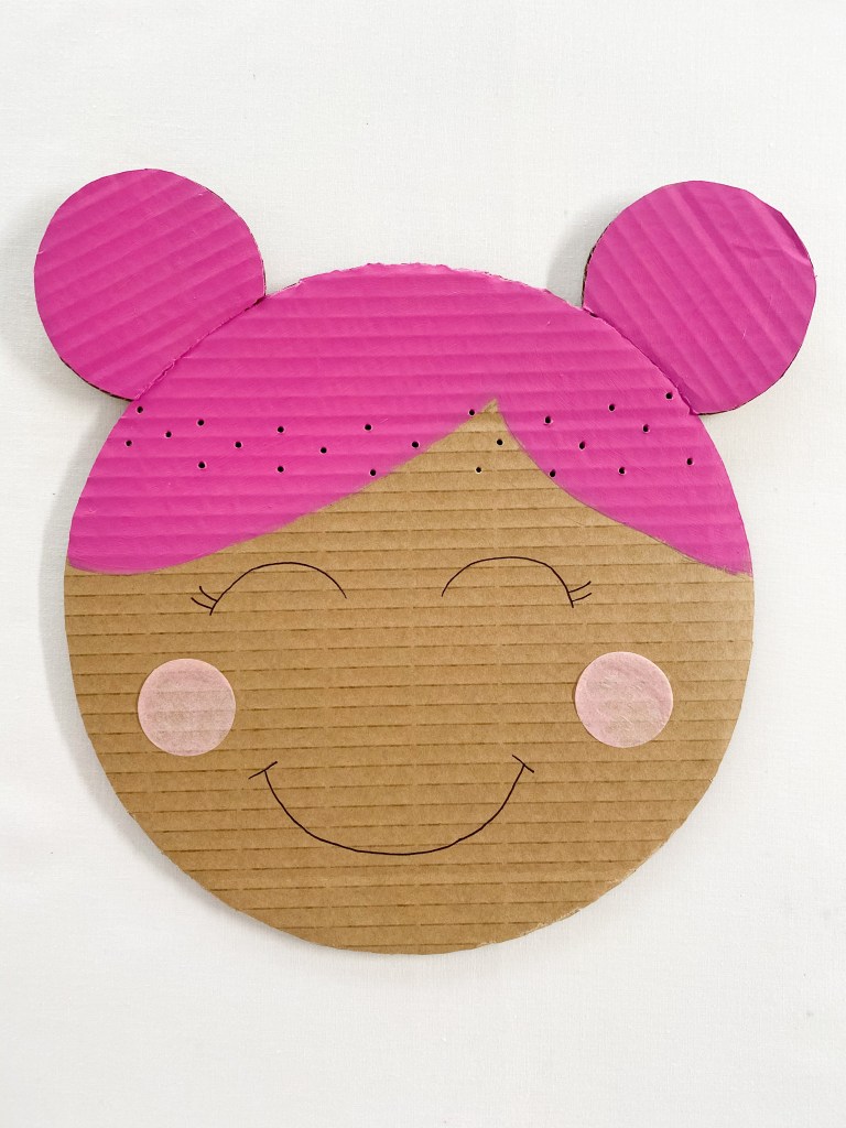 1. Using your pencil, draw the face shape onto your piece of cardboard. Cut around your drawing with pencil. Then paint the hair and use the marker pen to draw the face.