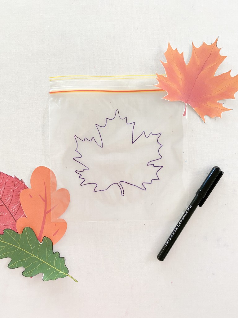 2. Trace the leaves onto the zip-lock bags with marker pen. You will have to make sure that you collect leaves that are slightly smaller than your bags. And if you can’t find any leaves that you LOVE, you could print some paper ones like we did!