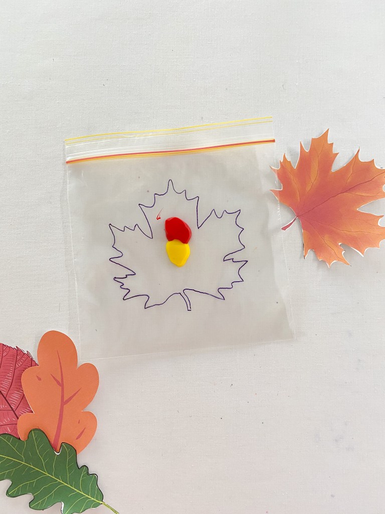 5. Once the paint is safely in the bag, squish it with your fingers. The idea is to both mix the colors together and keep the paint within the outlines of the leaves. This can be a little tricky for small children, especially when you are trying to mix the color evenly at the same time! See how you go!