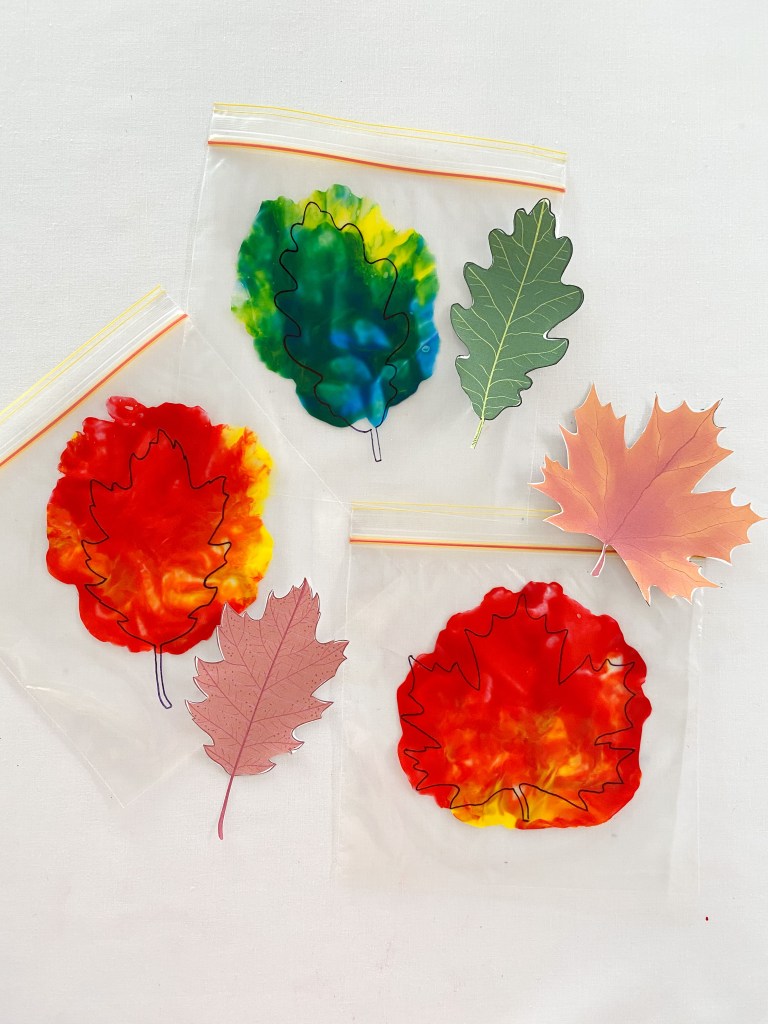 We have tried a few fall crafts over the years, but this one was really fun! I do want to point out that it does require single use plastic bags – which from an environmental view – we hate using. To make the activity worthwhile, we added quite a bit of paint to each bag, so that it didn’t dry out and we could play longer, and we ensured that once we had finished with the bags, we disposed of them carefully. And you could always wash the bags out and reuse them again too if you like!