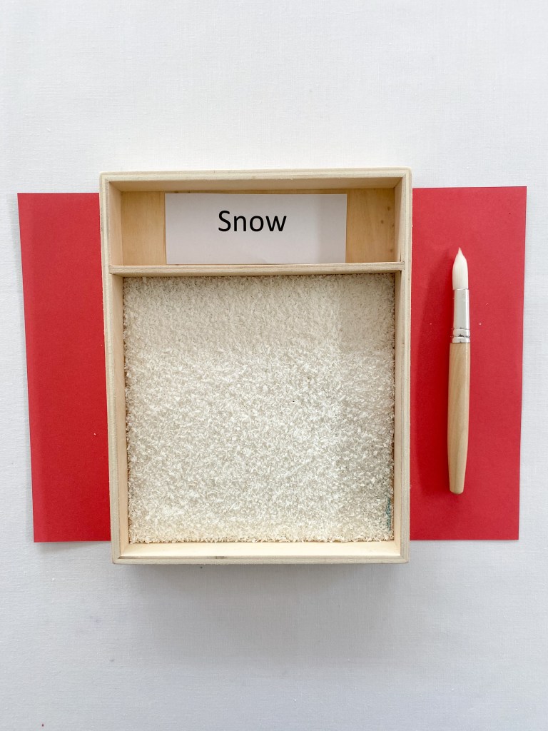 We started with letters. I typed up some words and then we used our paint brush to write each letter in the coconut snow! Once you have formed your letter, simply smooth over the coconut letter and start again!
