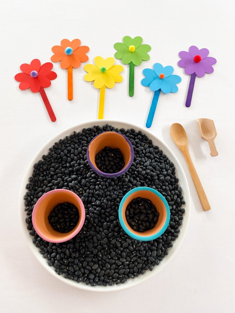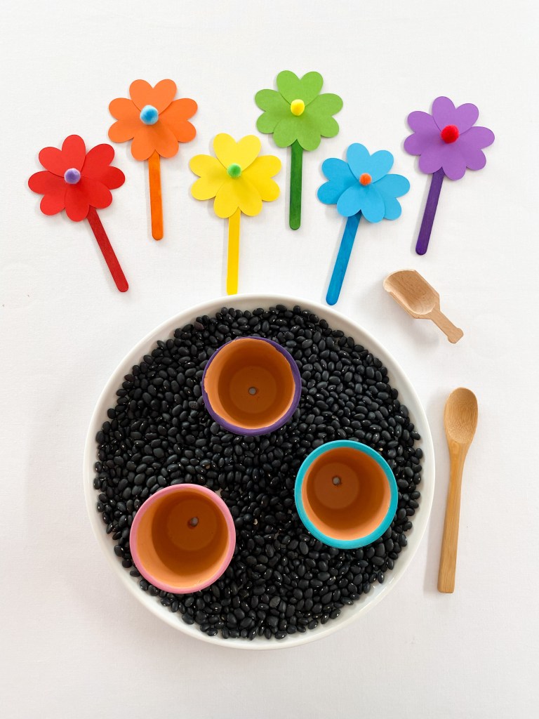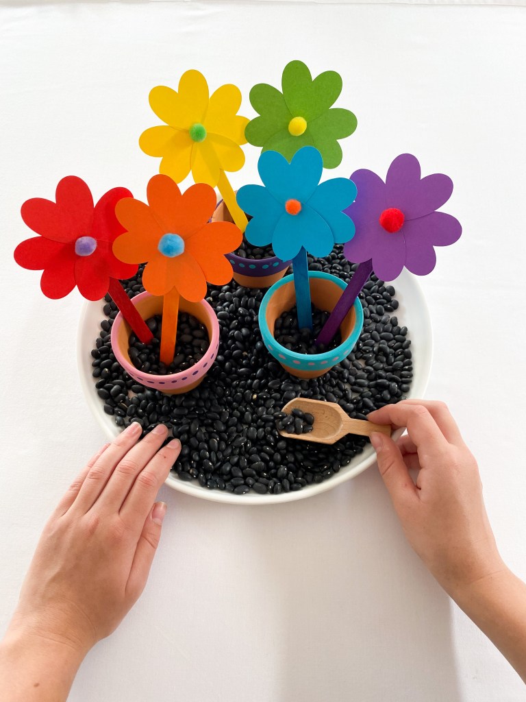 Sensory play and small world set-ups are super easy to create and are so much fun for toddlers and preschoolers to play and learn with! This Spring themed activity doubles as a fun craft – as you make the flowers from paper, and a hands on sensory play activity. You could also talk about some fun math concepts such as counting and volume too! You won’t need many items to create this set up, but children will have fun with it for hours!