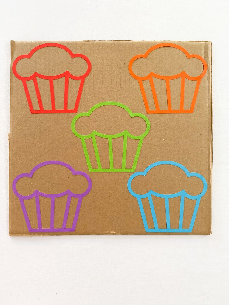 1. Cut some cupcake shapes from colored construction paper and paste them onto your piece of recycled cardboard. You could also draw them with marker pens. To be honest, this will probably be a lot quicker and easier than cutting the paper ones out 😉