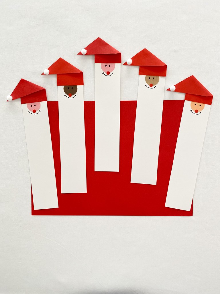 6. Glue down some pom poms to the ends of the hat and draw happy faces onto each Santa with black marker pen.
