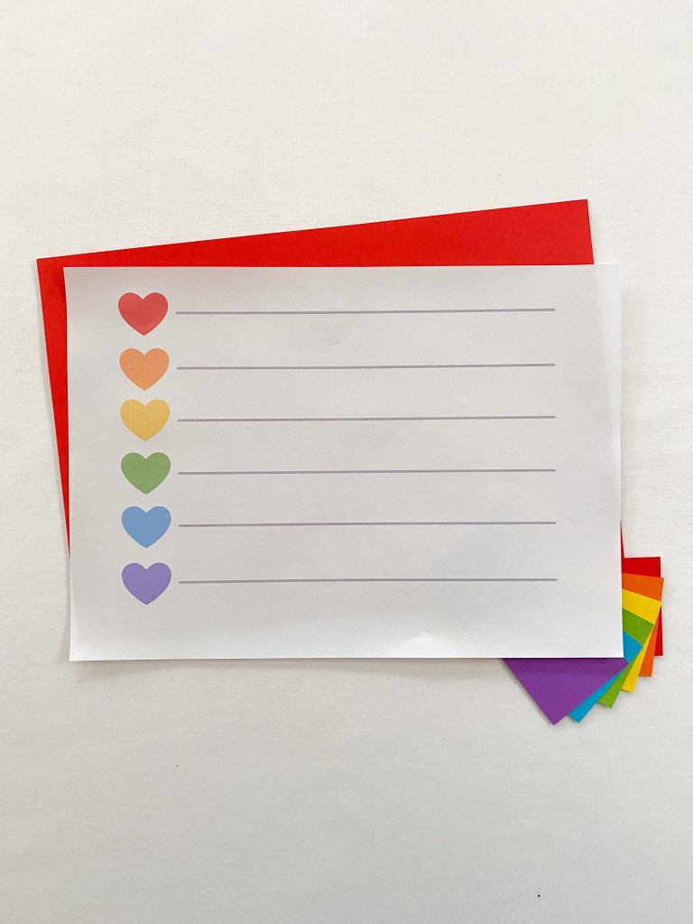 1. Prepare your worksheet. For this, I simply drew colored hearts down the left hand side of the white piece of printer paper. Then I ruled lines across the page with the black marker pen. Alternatively, you could print out the FREE template file below.