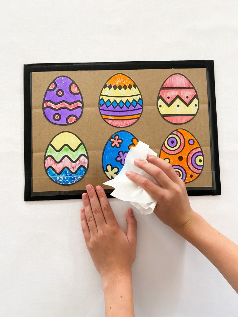 5. When you have finished your coloring and want to pack up, simply take a wet wipe or a piece of paper towel and wipe your coloring away. Then you can color again and again.