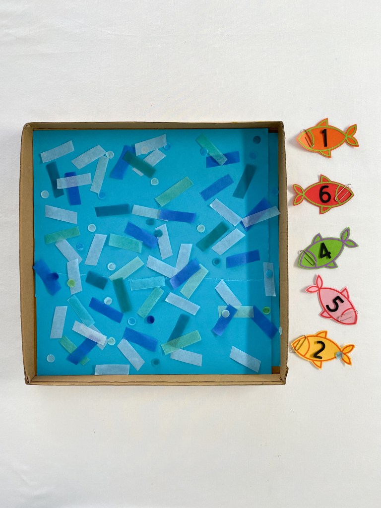3. If you would like to practice some early numeracy skills, you might like to add a number to each fish. You can collage the number with paper or simply write it out with pencil. You might also like to add some tissue paper to the box for some extra detail.