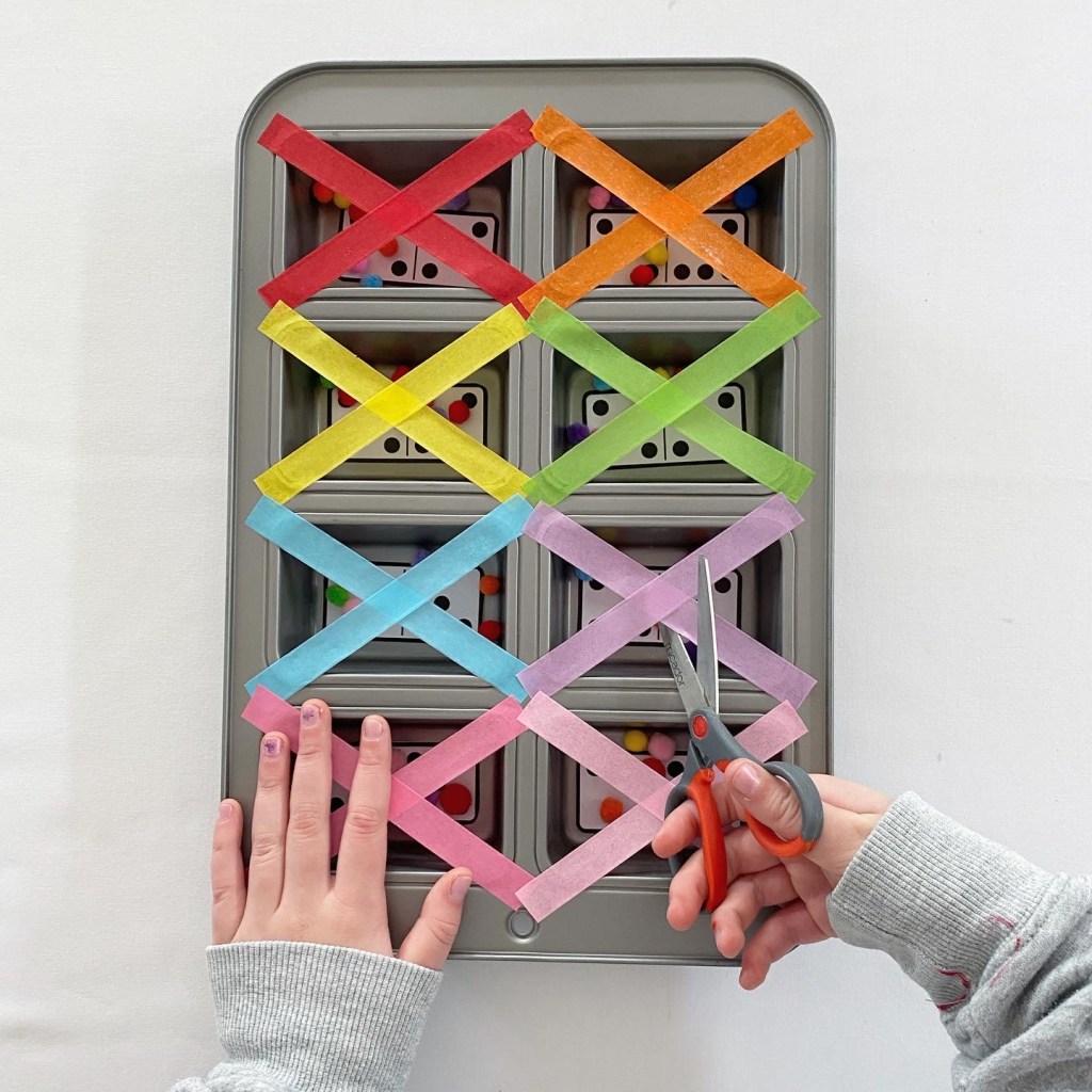 2. You may like to extend the activity by making it into a rescue game. To do this, place a dominoes piece into each well of a muffin tray. Add some pom poms to each well and then tape down some layers of sticky tape.