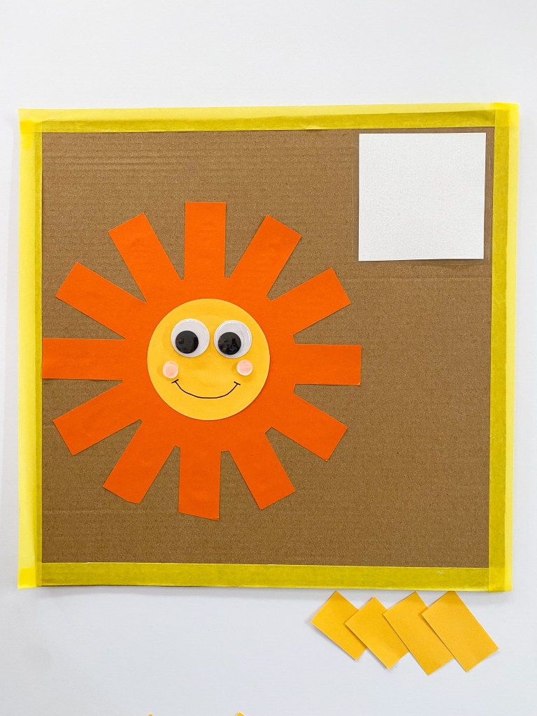 1. Cut a sun shape from some orange construction paper and glue it to the piece of recycled cardboard. You might like to give your sun a smiley face too! Next, paste a square of white paper to the top right hand corner of your cardboard. Cover the white square with a piece of clear sticky contact – this will make your board wipeable and allow it to be used over and over again. You will also need some small rectangle “sun rays. Cut these from yellow construction paper.