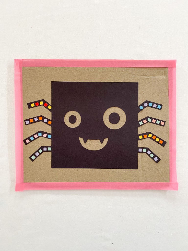 1. Cut a spider shape from black construction paper and glue it down onto a piece of recycled cardboard. Add some stickers to start a pattern. Your pattern could be simple alternating patterns or more complicated ones that involve 3 or more colors or shapes. You might also like to add a border of washi tape to finish your game.