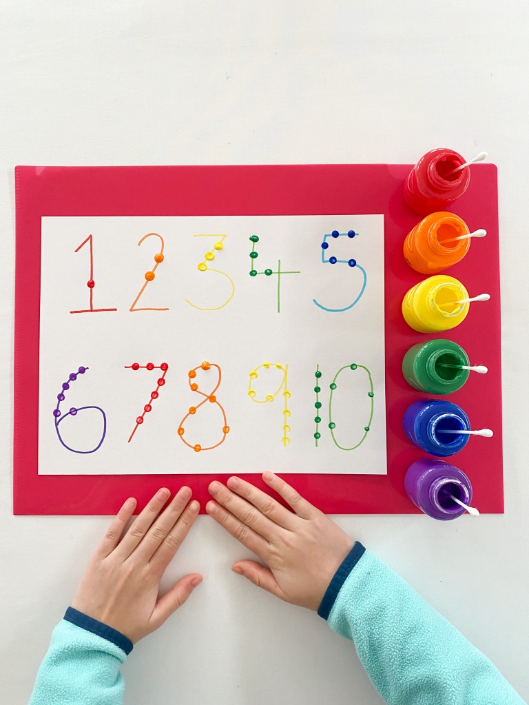 Q-tip painting is a favorite activity of ours! It is relatively mess-free and is perfect for developing fine motor skills. This activity is the best way for kids, preschoolers and toddlers to practice shape, number and letter recognition. Best of all, it’s lots of fun!