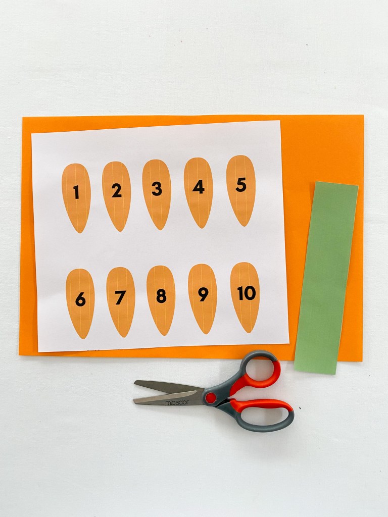 2. Use your scissors to carefully cut around each numbered carrot. Remember that scissors are sharp. Adults should always carefully supervise children when they are holding and using scissors!