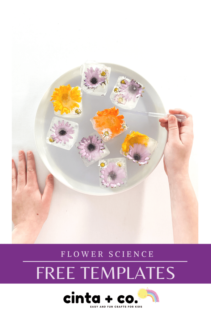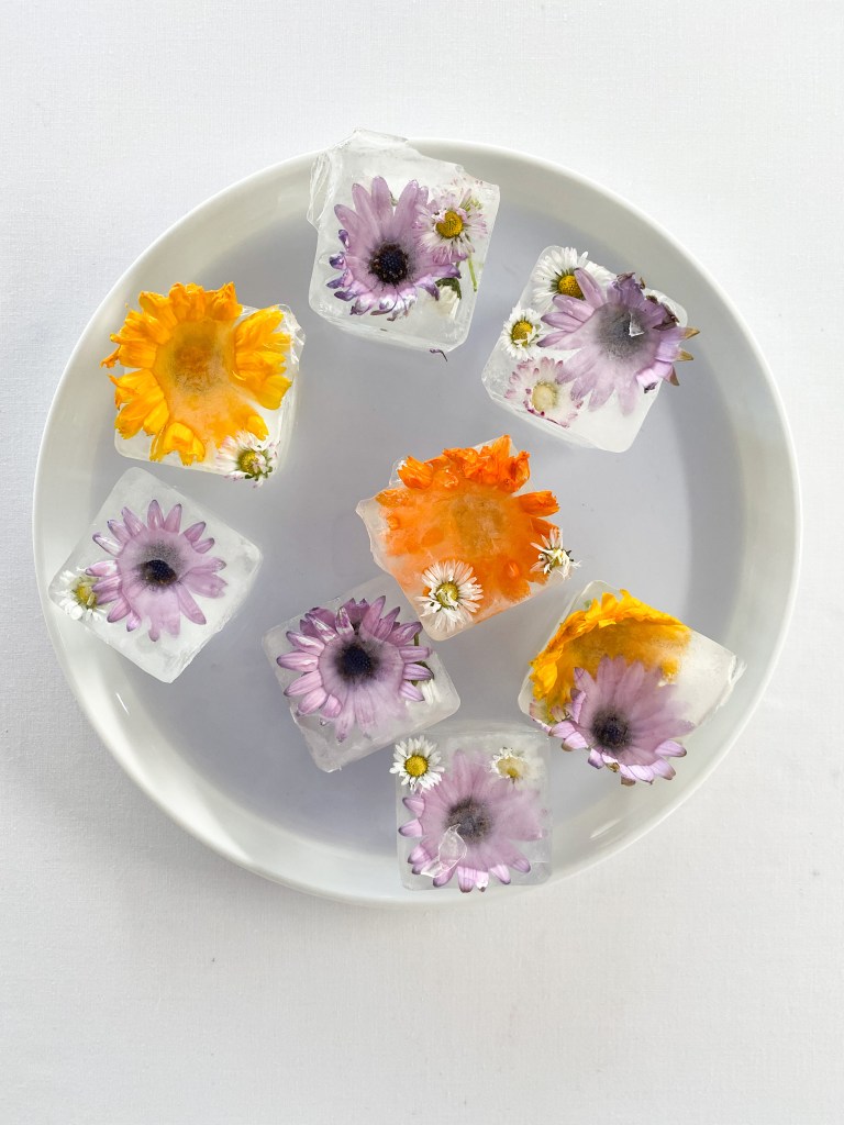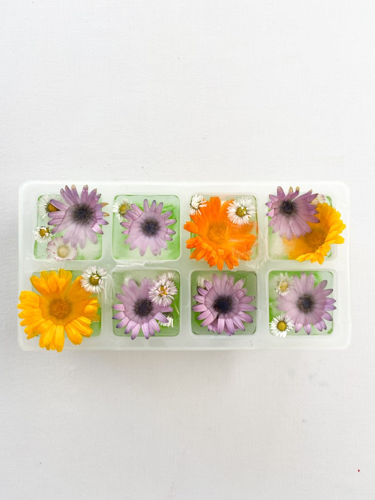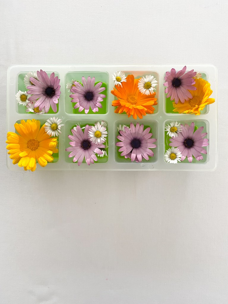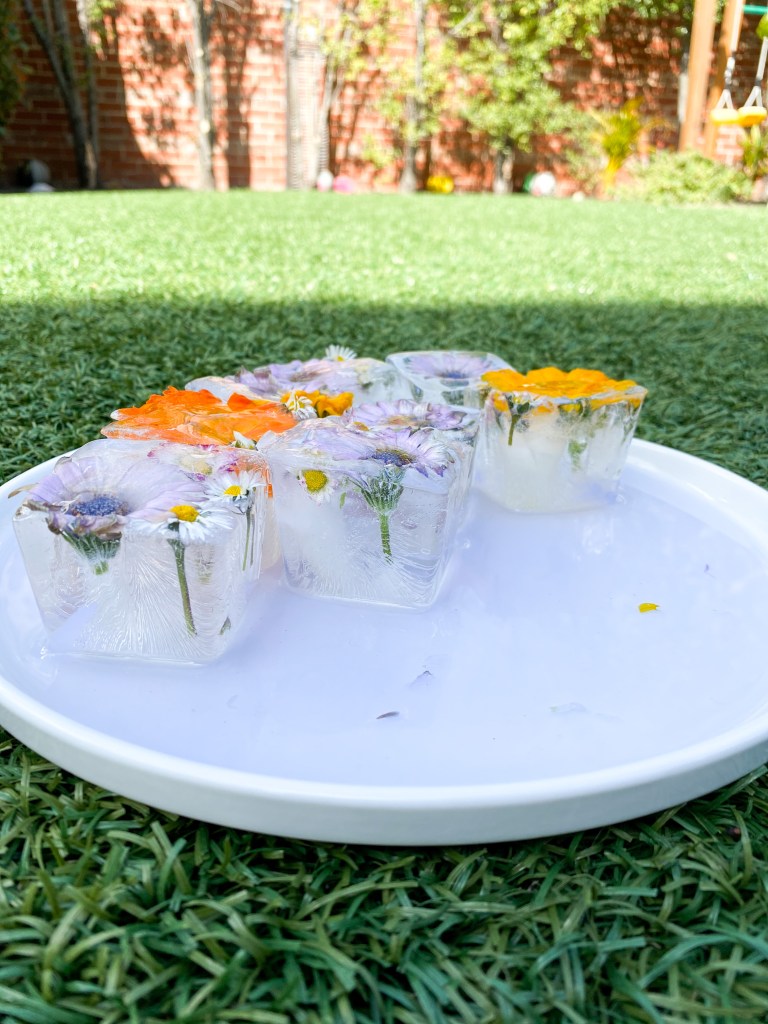 Once we were home, we placed the flowers into an over sized ice cube tray, filled the tray with water and popped them into the freezer. To be totally honest, that’s where they sat for the next couple of weeks! But, we finally pulled them out yesterday and had the best time with them.