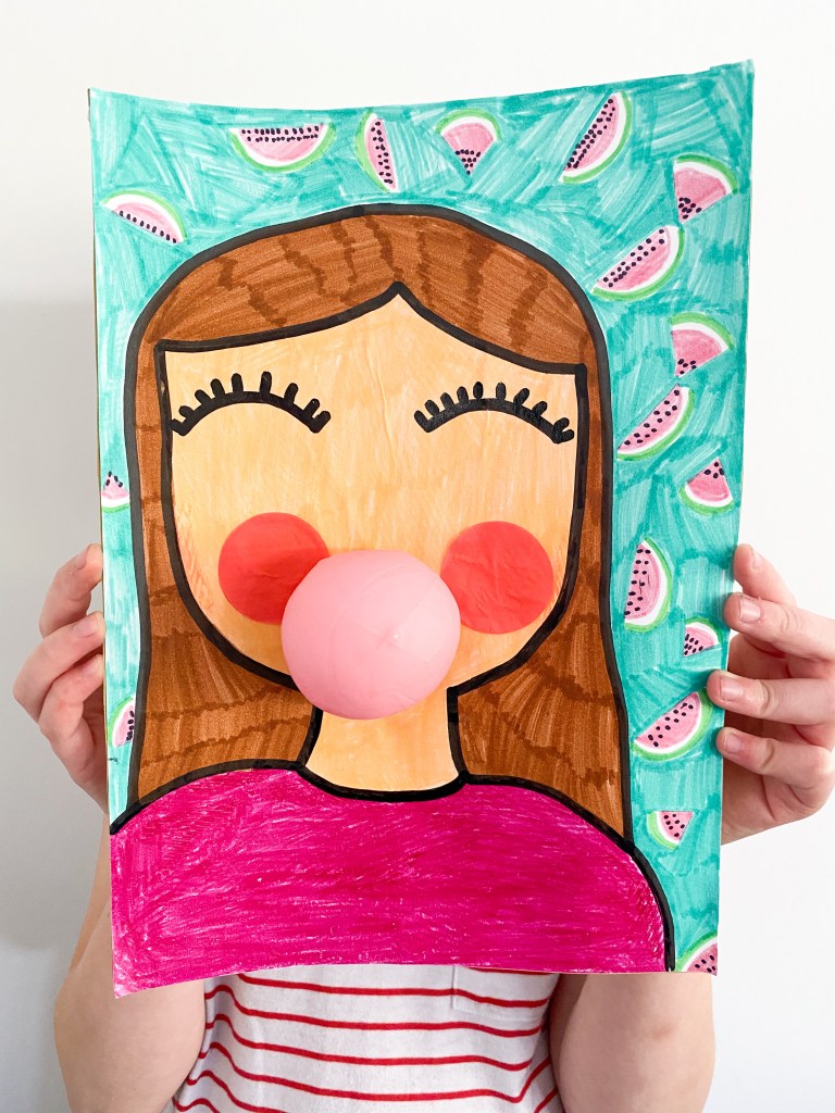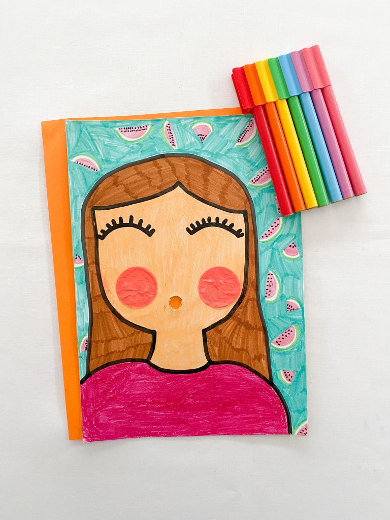 3. Add a pattern to the background and lots more color. We pasted some confetti onto the cheeks!