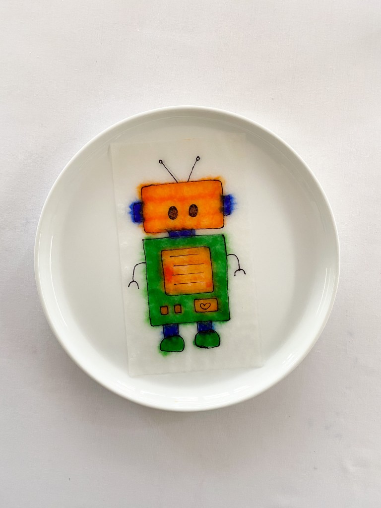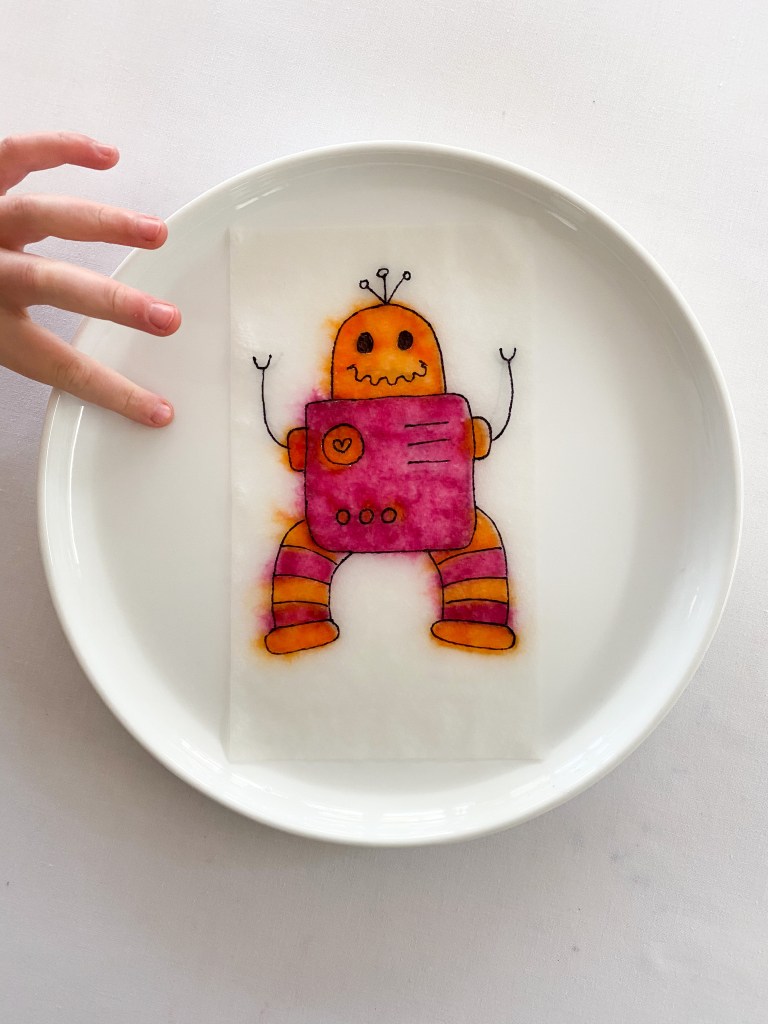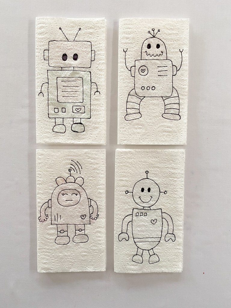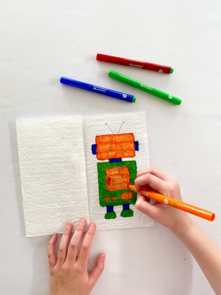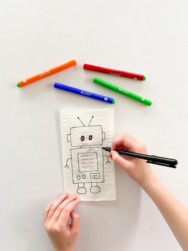 1. Tear the paper towel into individual sheets and fold each piece in half. Open the paper towel and draw on the right hand side of the fold with the washable markers. You can draw anything that you like. We drew robots for this experiment. And if you prefer, you can lightly draw your pictures with pencil first and then color with markers.