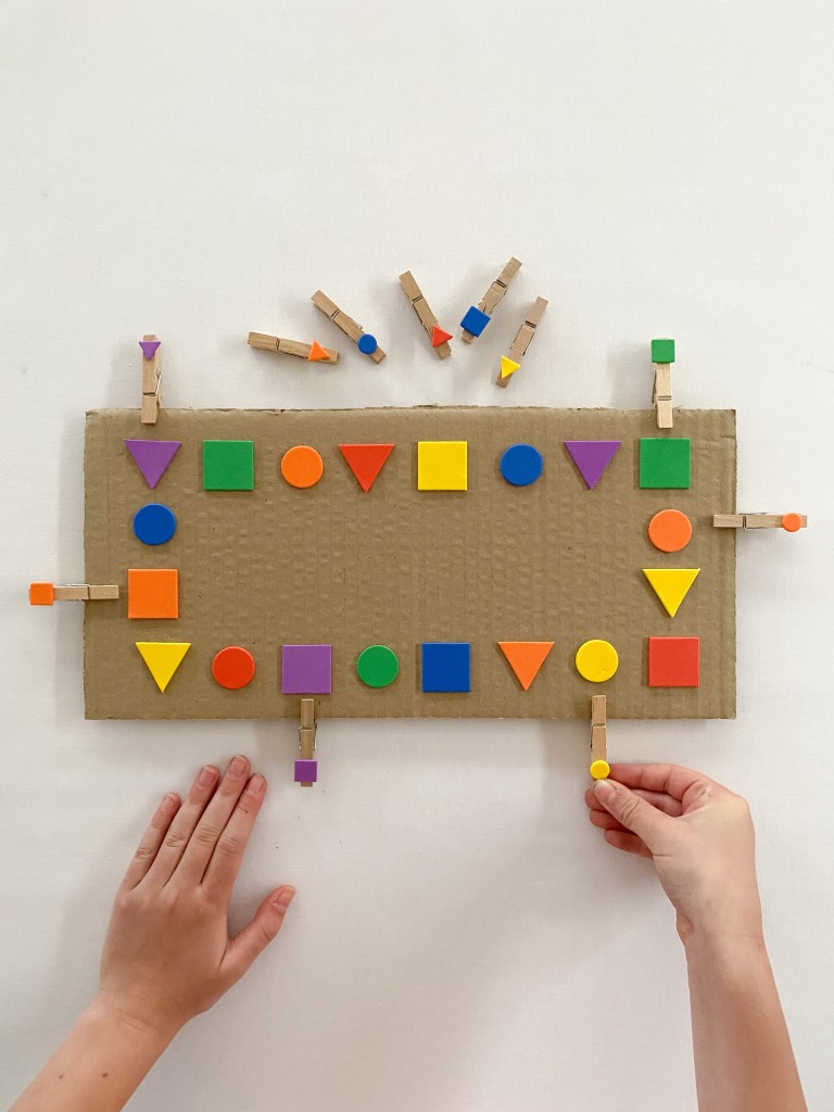 2. Next, prepare your matching pegs. I used small shape stickers to label our pegs. As our game is a shape and color matching game, I made sure that the pegs were labelled with the same colored shape as the shapes on the cardboard.